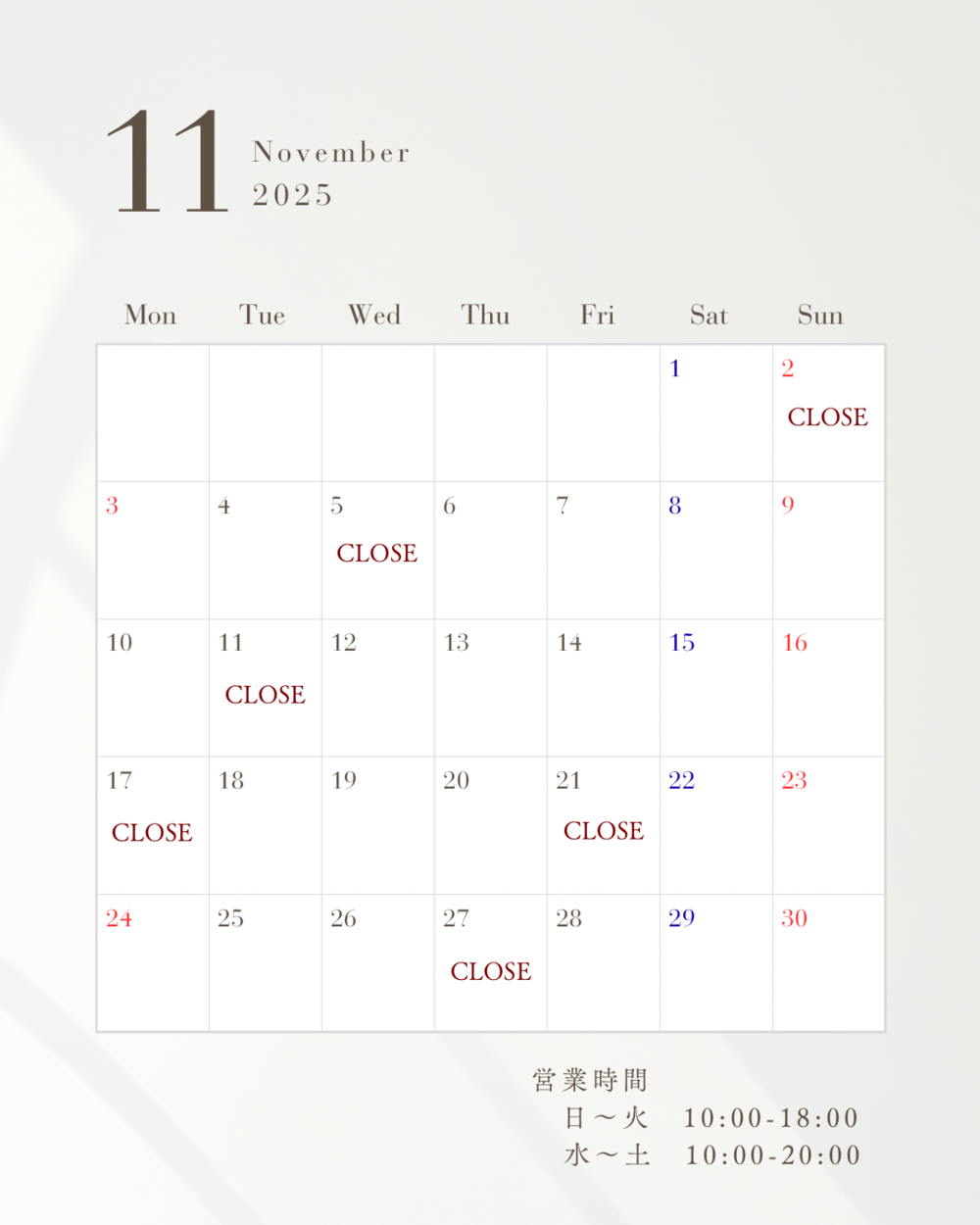 11月のサロン定休日のお知らせ📢